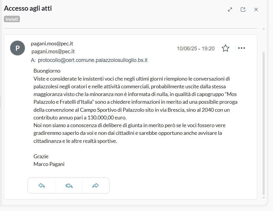 Però a tal proposito, visto che siamo persone serie, siamo riusciti a recuperare uno screenshot di un protocollo in cui chiediamo informazioni sempre inerenti alla questione convenzione PRO Palazzolo. A seguito di questo protocollo il Consigliere è stato convocato dal Sindaco per un colloquio verbale ma formalmente la richiesta non è mai stata evasa.