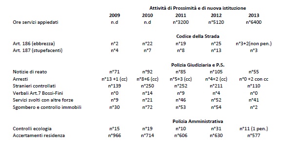 Questa considerazione nasce dai dati in merito alla sicurezza della Polizia Locale. I dati degli anni 2012 e 2013, ricevuti dagli uffici in seguito ad una richiesta d’accesso agli atti del 5/11/2013 protocollo n° 28584, sono stati confrontati con dati relativi agli anni 2009, 2010 e 2011, di cui eravamo già in possesso dall’Amministrazione precedente. Abbiamo pensato di costruire una tabella che potesse mostrare a tutti, la veridicità delle nostre affermazioni.
