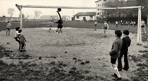 guardano i ragazzi del paese che inseguono un pallone, che effettuano i classici riti di scaramanzia iniziali senza pressioni alcune, come: allacciarsi le scarpe sempre allo stesso modo, salutare prima di entrare nello spogliatoio la propria fidanzata, mettere sempre la stessa maglietta e/o mutande sotto la muta ufficiale, bagnarsi i capelli prima di entrare, fare sempre gli stessi scatti in sequenza prima della partita, fare la foto ufficiale girati dall’altra parte perché 10 anni fa ha portato bene.. ecc, ecc