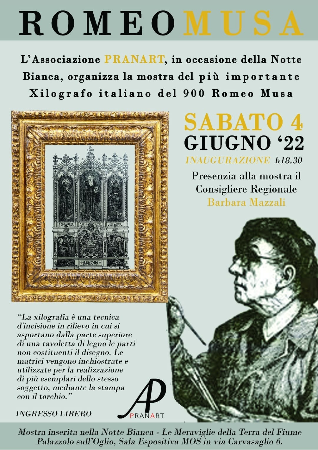 Sabato 4 giugno 2022 l’Associazione PRANART organizza, in occasione della Notte Bianca – Le Meraviglie delle Terre del Fiume, la mostra di ROMEO MUSA il più importante xilografo italiano del ‘900. Una collezione privata con pezzi inediti.