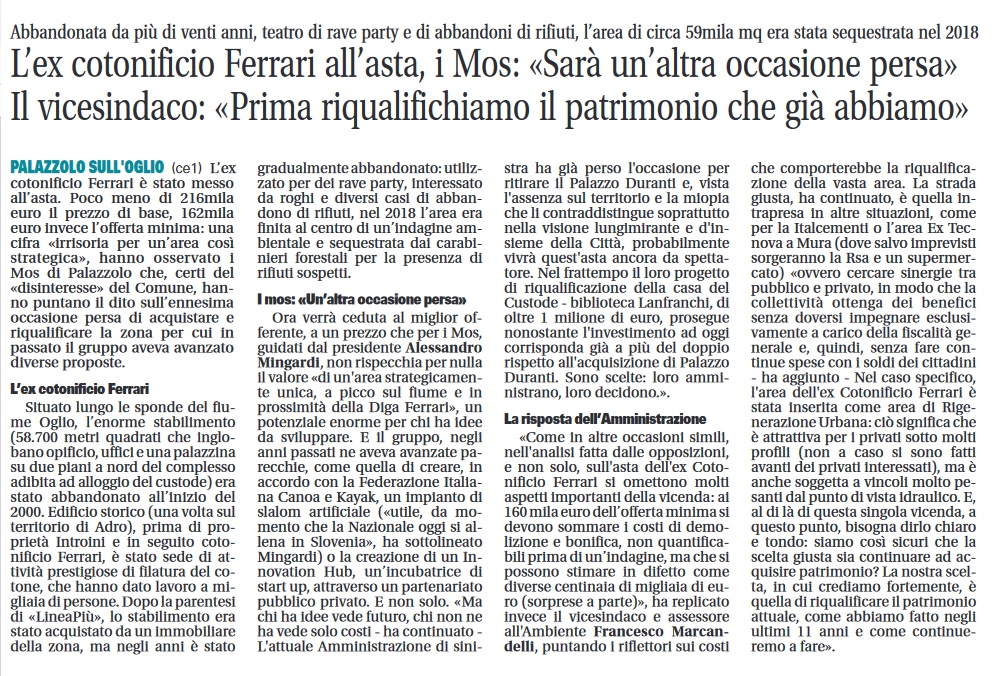 Il 17 ottobre pubblicammo un articolo relativo all’asta dell’area “Ex Cotonificio Ferrari” con offerta minima di β¬ 161.552,29. Un’area strategicamente unica, a picco sul fiume e in prossimitΓ della Diga Ferrari. Potenziale enorme per chi ha idee da sviluppare.