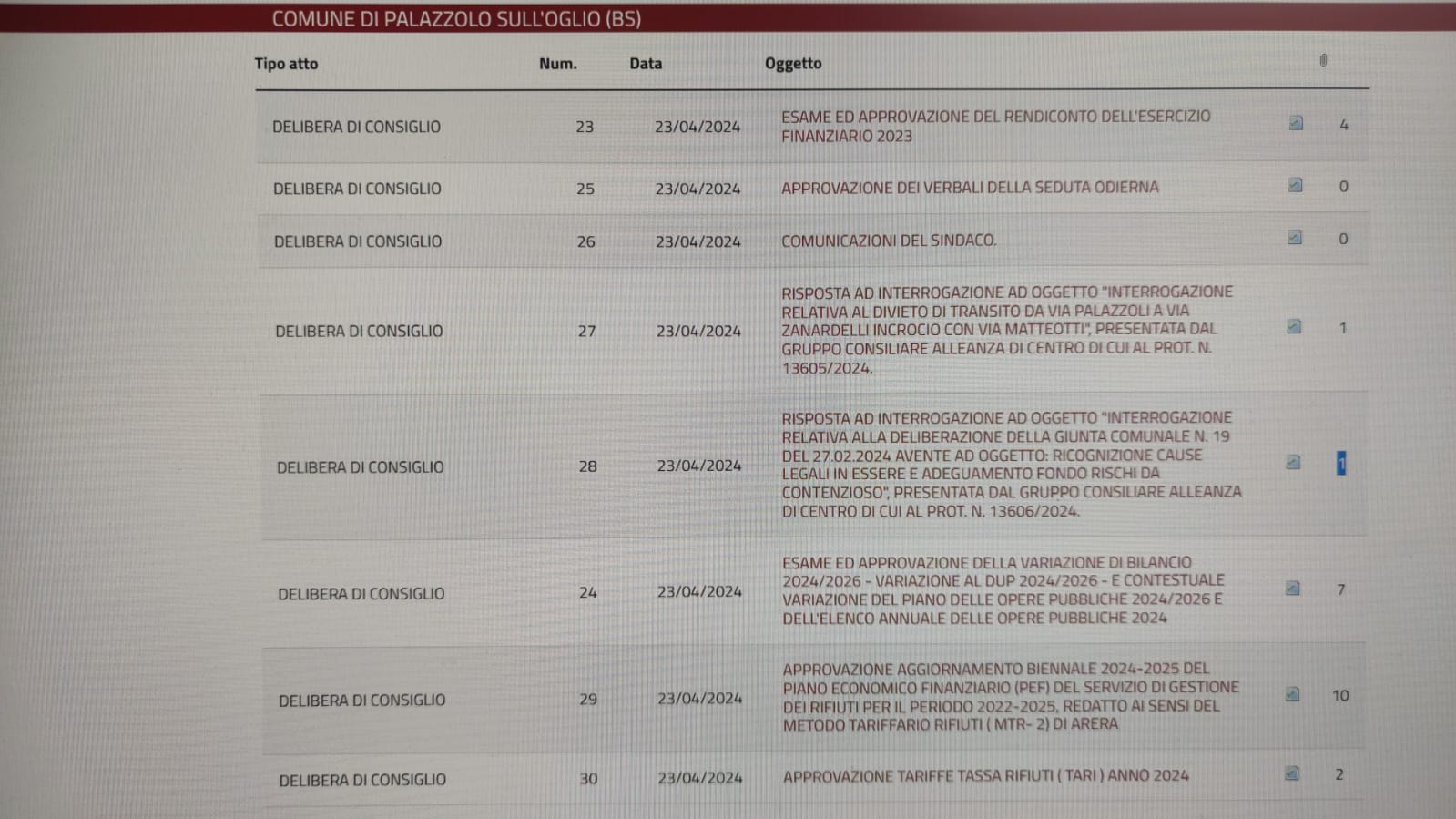 (Screenshot del cruscotto accessibile ai consiglieri del 18/04/24 h10.33)