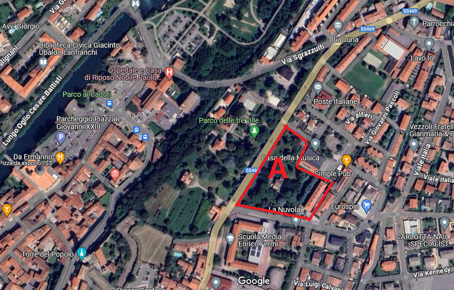 Area che comprende “Ex Mulino Betti” e un grande parco che costeggia la seriola prevedeva sia una RSA da n.80 posti per traslocare “Don Cremona” sia una parte destinata ad Housing Sociale. La zona è già fornita di parcheggi e ben collegata dal punto di vista della viabilità.