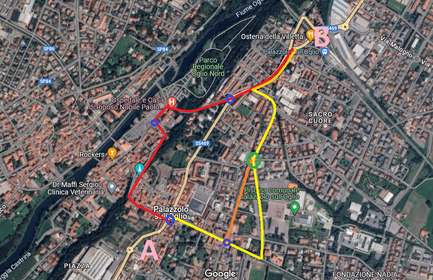 Per facilitare la comprensione ai cittadini vi abbiamo disegnato i tragitti percorribili dal punto A per andare al punto B con il senso unico di via Zanardelli. Anche un bambino comprende che è concettualmente sbagliata al giorno d’oggi la scelta attuata dalla sinistra perchè il traffico va deviato verso l’esterno e non all’interno dei centri ad alta intensità abitativa.