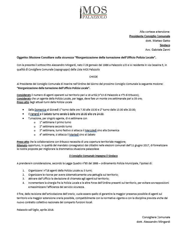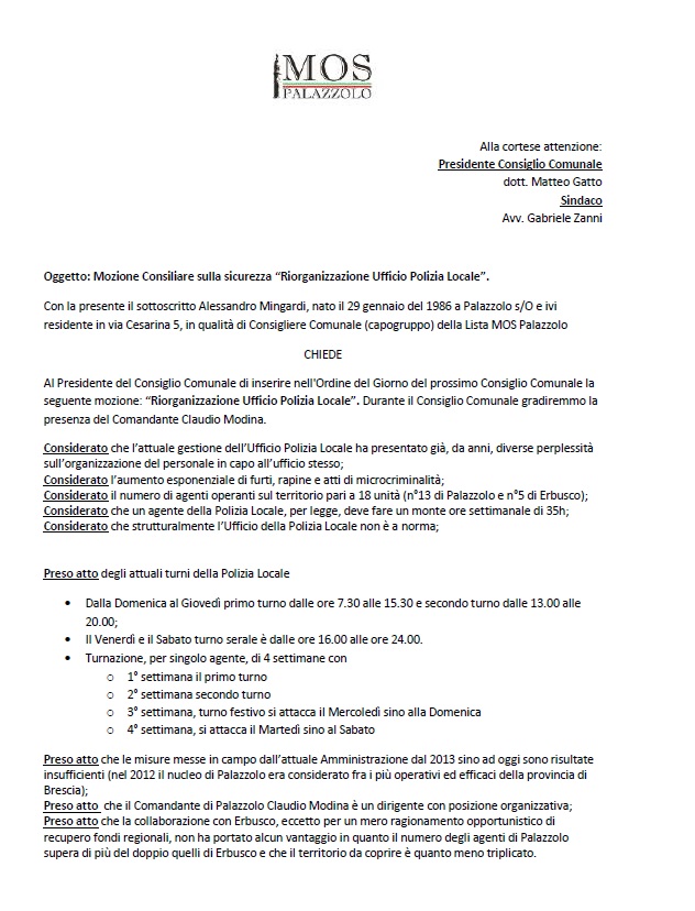 Nella precedente legislatura il gruppo “MOS PALAZZOLO” presentò due mozioni in merito alla riorganizzazione e all’ampliamento dell’Ufficio Polizia Locale, con l’obiettivo di coprire su tre turni il territorio 24/24h tutti i giorni della settimana. Le mozioni presentate: