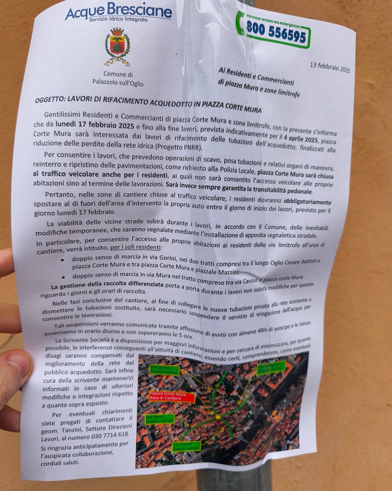 Giovedì 13 febbraio 2025 la società Acque Bresciane ha affisso per le vie di Mura una missiva, con tanto di logo comunale, nella quale comunicava l’inizio dei lavori per la sistemazione della rete idrica a partire da lunedì 17 febbraio con data fine lavori fissata ad aprile 2025. Due mesi di lavori con la chiusura di Piazza Corte Mura e il blocco completo del traffico veicolare con accesso solo pedonale.