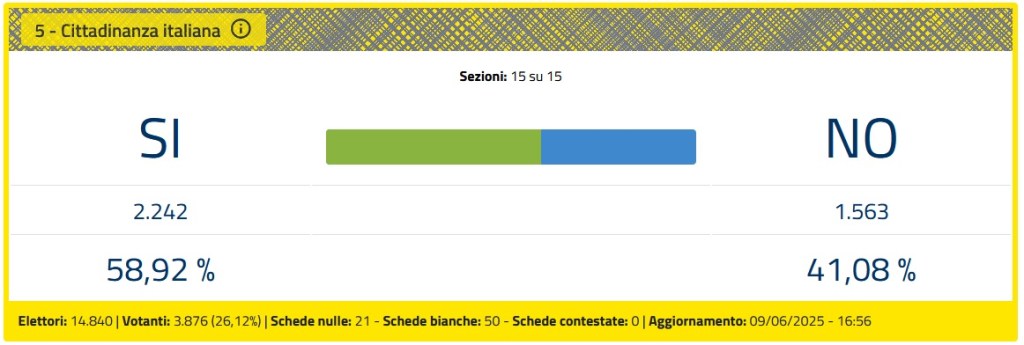 Premesso che ognuno è libero di votare ciò che ritiene opportuno, perchè questa è la base della democrazia, riteniamo doveroso sottolineare come la chiamata alle urne non abbia riscosso successo e vogliamo evidenziare il dato del quesito n.5 in cui anche l’elettorato tendenzialmente di sinistra boccia le politiche migratorie con il 41,08% pari a 1563/3876 elettori. E’ un dato forte che dovrebbe far riflettere tutti quelli che pensano di regalare la cittadinanza dopo 5 anni, non curanti del peso che questa scelta avrebbe potuto avere sul walfere con ricongiugimenti familiari, pensioni sociali ecc.