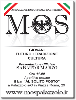 | I MOS saranno lieti di presentarsi Sabato 3 Marzo alle ore 11:00 presso il bar “Al Solito Posto” in Piazza Roma a Palazzolo sull’Oglio (BS). | |