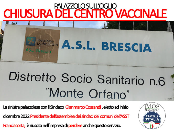 𝗗𝗮 𝗶𝗻𝗶𝘇𝗶𝗼 𝗮𝗽𝗿𝗶𝗹𝗲 𝟮𝟬𝟮𝟯 𝗻𝗲𝗹 𝗗𝗶𝘀𝘁𝗿𝗲𝘁𝘁𝗼 𝗦𝗼𝗰𝗶𝗼 𝗦𝗮𝗻𝗶𝘁𝗮𝗿𝗶𝗼 𝗻.𝟲 “𝗠𝗼𝗻𝘁𝗲 𝗢𝗿𝗳𝗮𝗻𝗼” 𝗔𝘀𝘀𝘁 𝗙𝗿𝗮𝗻𝗰𝗶𝗮𝗰𝗼𝗿𝘁𝗮 𝗱𝗶 𝗣𝗮𝗹𝗮𝘇𝘇𝗼𝗹𝗼 𝘀𝘂𝗹𝗹’𝗢𝗴𝗹𝗶𝗼 𝘃𝗲𝗿𝗿𝗮̀ 𝗖𝗛𝗜𝗨𝗦𝗢 𝗶𝗹 𝗖𝗲𝗻𝘁𝗿𝗼 𝗩𝗮𝗰𝗰𝗶𝗻𝗮𝗹𝗲. Da aprile gli utenti che dovranno vaccinarsi saranno costretti a recarsi ad Iseo o Chiari (BS). Chiudere un Centro Vaccinale in una Città di 21 mila abitanti in mezzo alle due province di Brescia e Bergamo vuol dire PERDERE i seguenti servizi: