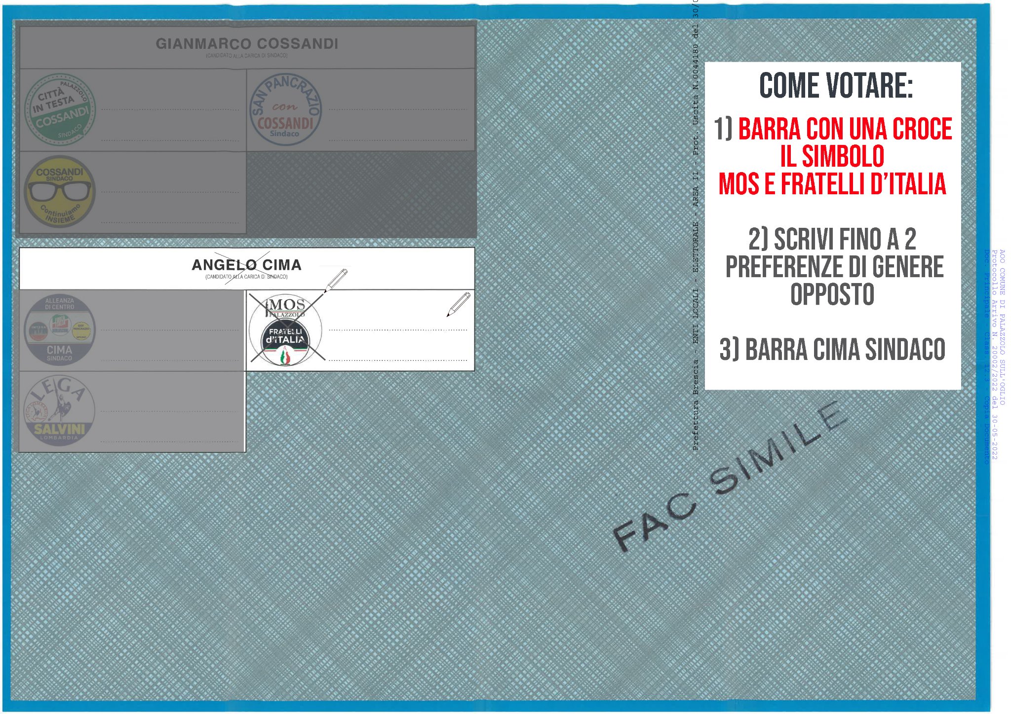 Domenica 12 giugno 2022, dalle ore 7.00 alle ore 23.00, urne aperte per eleggere la nuova amministrazione comunale. Per votare è necessario essere muniti di tessera elettorale e documento d’identità. Per sostenere la nostra squadra, il nostro gruppo, le nostre idee e i nostri progetti, devi: fare una CROCE sul simbolo “MOS PALAZZOLO E FRATELLI D’ITALIA”; scrivere massimo due preferenze di genere opposto, ovvero un uomo e una donna.