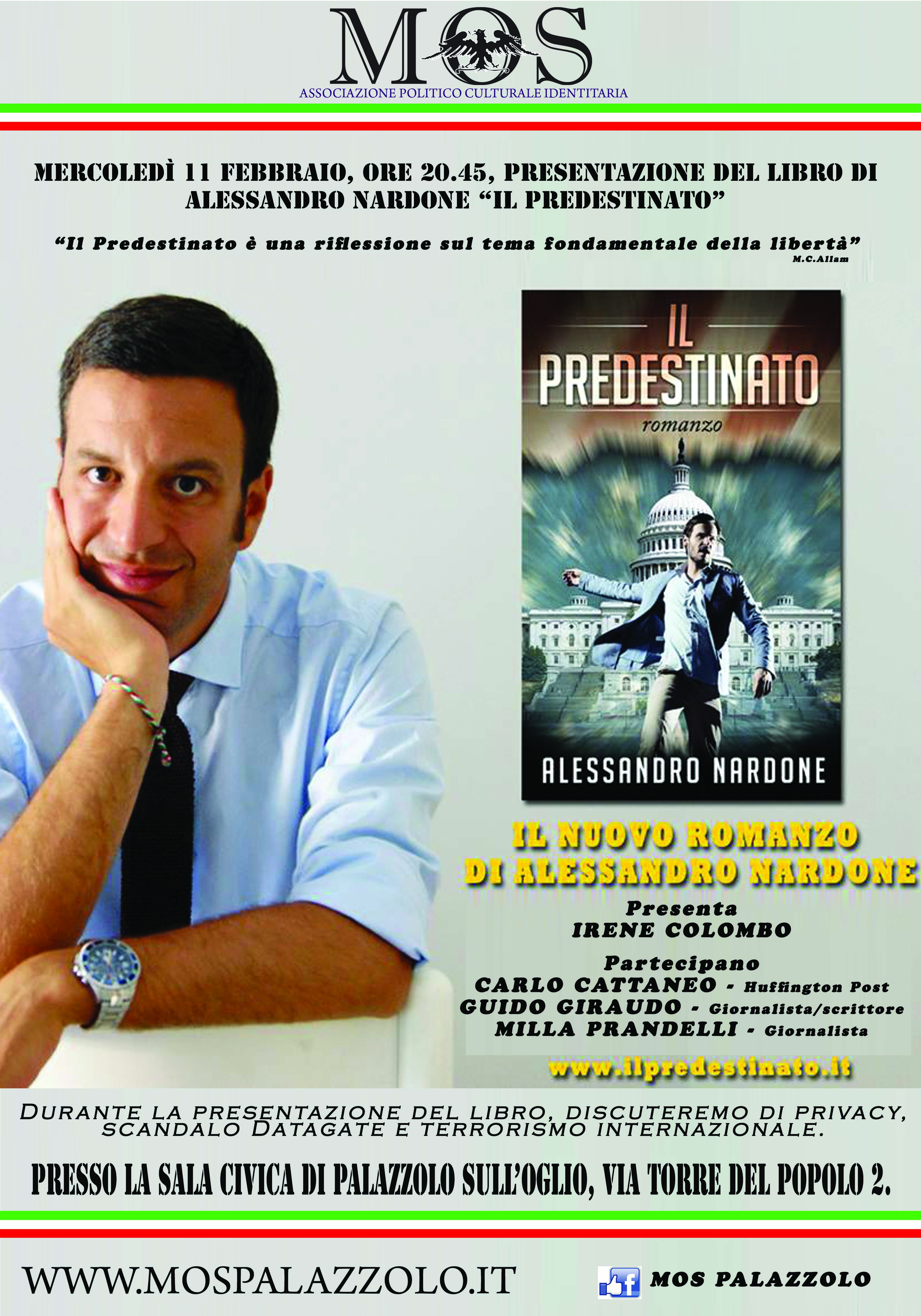 L’Associazione MOS, Mercoledì 11 febbraio alle ore 20.45, presenta, nella Sala Civica del Comune di Palazzolo sull’Oglio in via Torre del Popolo 2, il libro “Il Predestinato” di Alessandro Nardone. Durante la presentazione del libro si discuterà di Privacy, Datagate, Libertà d’espressione e Terrorismo Internazionale. E’ possibile vedere il booktrailer del romanzo tramite il seguente link www.ilpredestinato.it